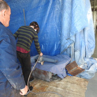 Lyndsay had set up a temporary spray booth and paint preparation area in another corner of the shed. His background in panel beating was invaluable as he guided the students through the process of straightening panels, preparing components for paint, and using the spray gun. He set the system up so that as each student cleaned up a part, they followed it through to completion, thus seeing their finished product completely restored.